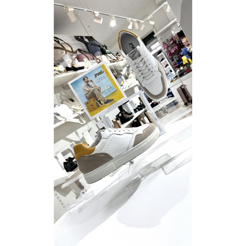 SCARPE DI PELLE BIANCHE CON DETTAGLI GIALLO E CUOIO ALLACCIATE PLANTARE ESTRAIBILE IN PELLE IMAC MADE IN ITALY COMODE E LEGGERE