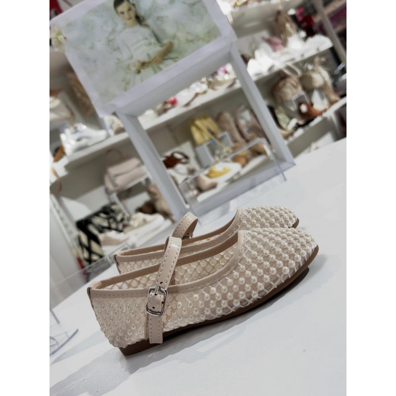 BALLERINE DI TESSUTO TRASPARENTE CON PERLINE E CINTURINO DISPONIBILI IN BEIGE E ROSA