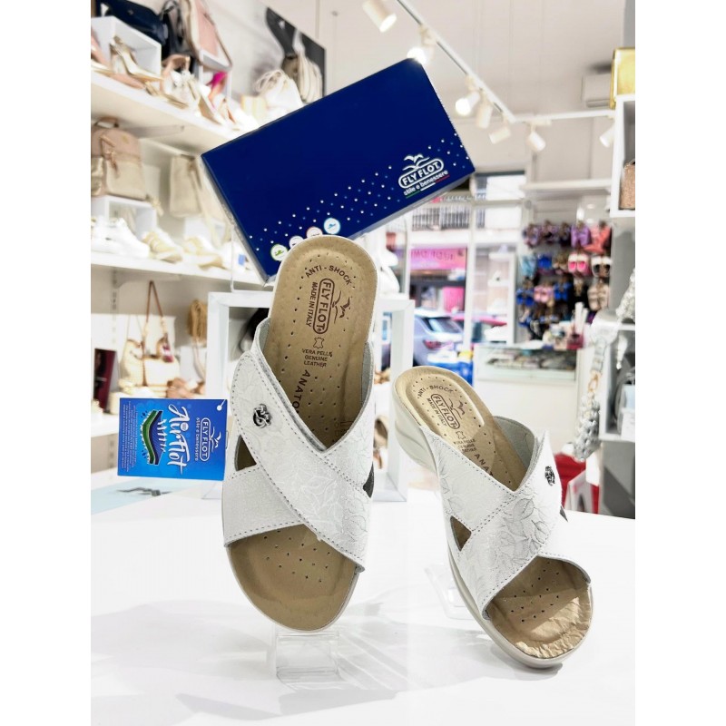 CIABATTE DI VERA PELLE CON FASCE AD INCROCIO BIANCHE CON SFUMATURE GRIGIO E STRAPPO SOTTOPIEDE IN PELLE ZEPPA MEDIA BY FLY FLOT